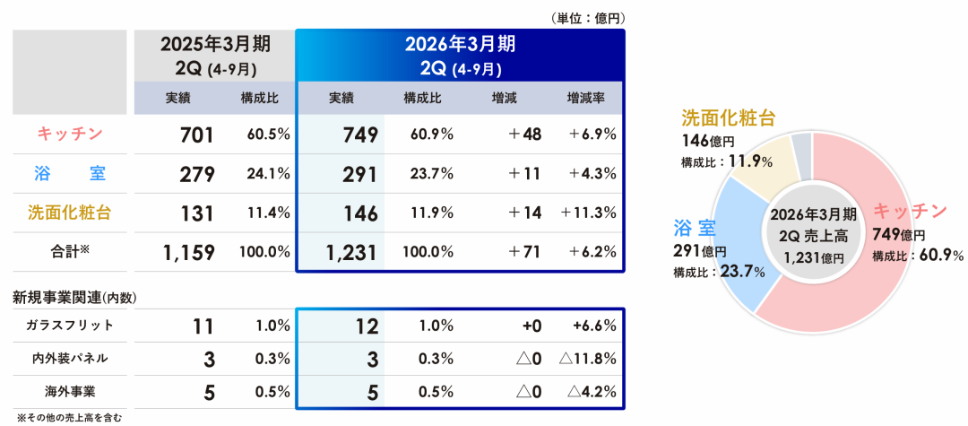 据财报,Takara Standard在2025年4-9月实现销售额1231亿日元(约合人民币59.25亿元,以9月30日收盘汇率计算,下同),同比增长6.2%,创历史新高;各项利润数据也较上年同期显著增长,其中营业利润增长46.3%至87亿日元(约合人民币4.19亿元),归属于母公司股东的净利润也大增79.0%至69亿日元(约合人民币3.32亿元),净利润占销售额总数从上年同期的3.3%上升至本期的5.6%。利润增长的主要原因是面向新建渠道的销售额增加,原材料成本下降,库存减少带来的物流费用削减及生产效率提高也是原因之一。